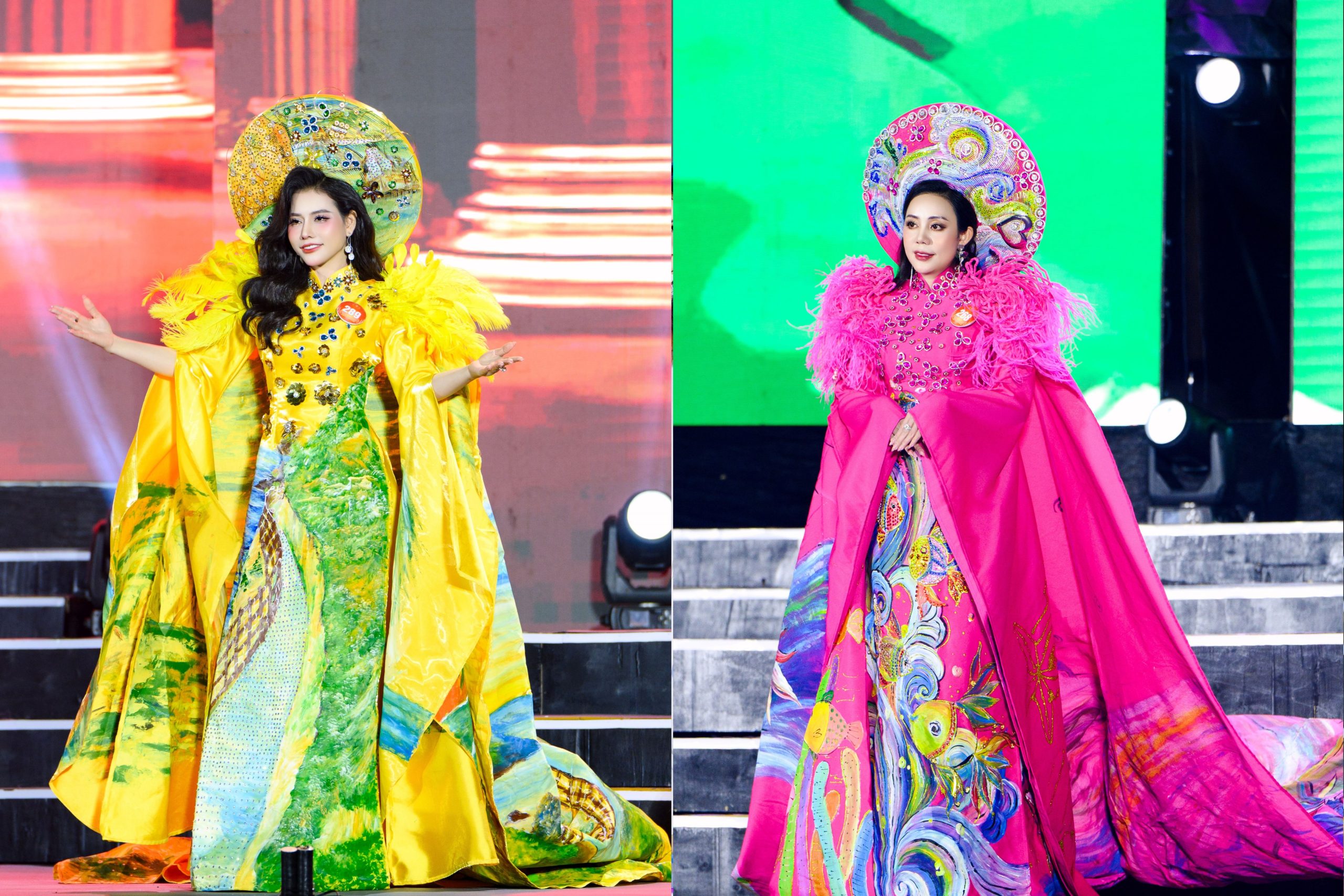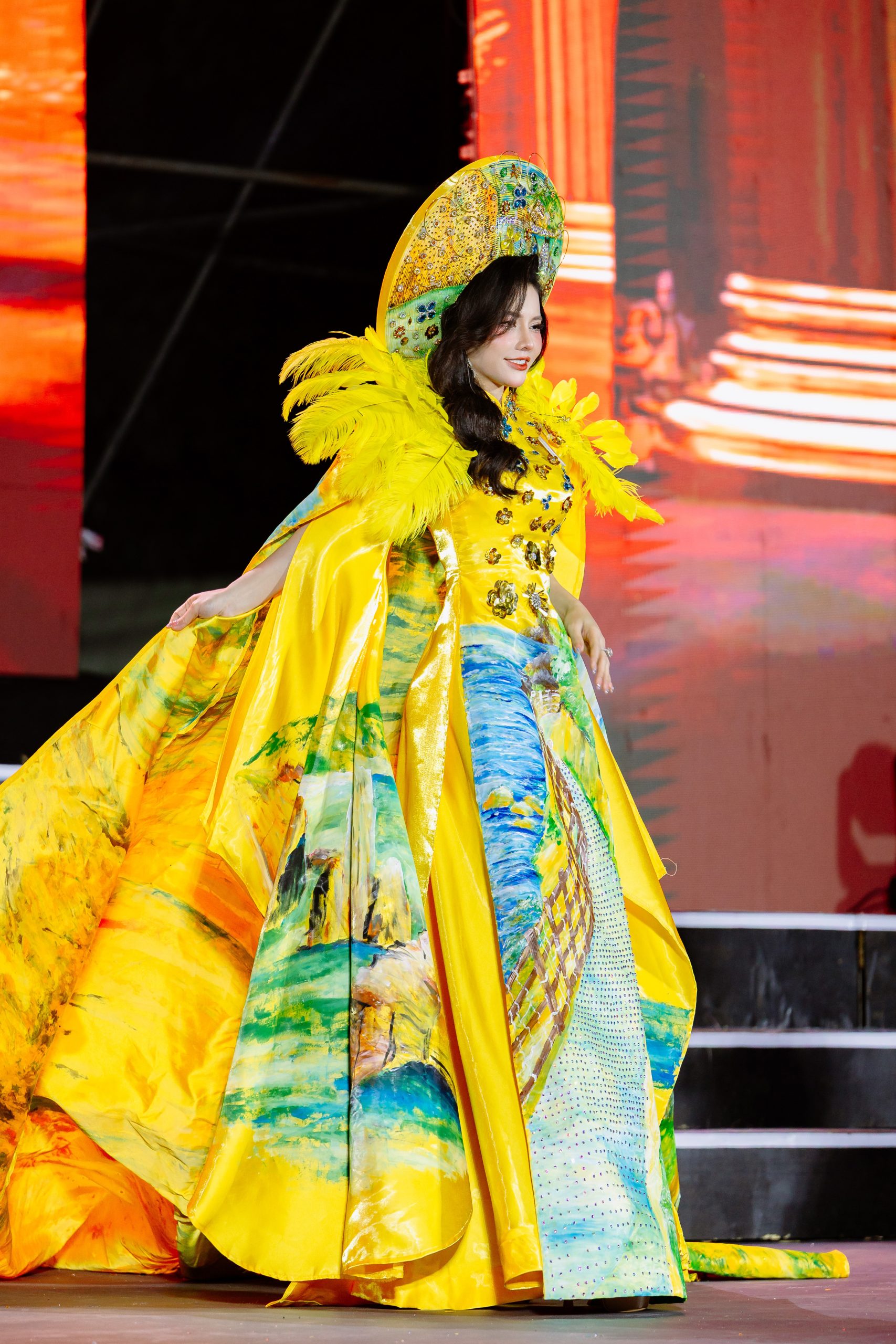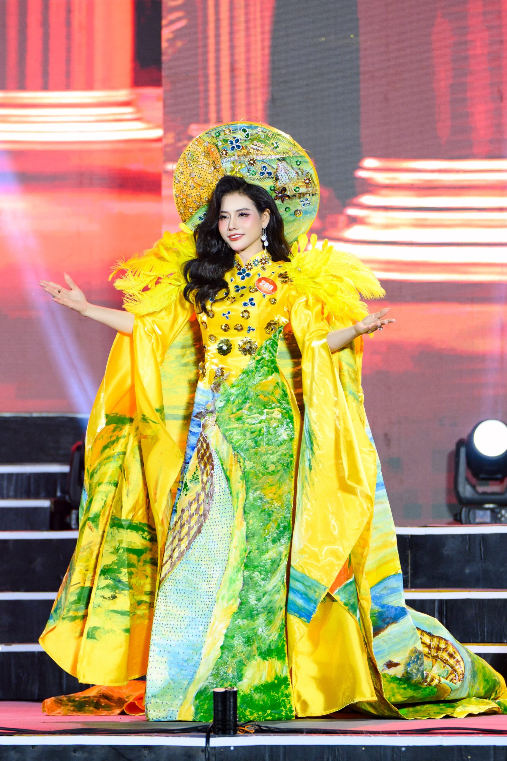 Nếu First Face là sự hòa quyện giữa biển và rừng, thì thiết kế Vedette áo dài “Tinh hoa đại ngàn” lại mang chiều sâu lắng đọng hơn. Trên nền áo dài truyền thống, những họa tiết lấy cảm hứng từ văn hóa bản địa Gia Lai được khắc họa đậm đà bản sắc. Qua bàn tay sáng tạo của Tony Phạm, vẻ đẹp văn hóa Tây Nguyên được hiện lên một cách đầy tự hào về đất và người Việt Nam. Mỗi họa tiết, mỗi gam màu trên tà áo đều như chất chứa một câu chuyện văn hóa, một nhịp thở của đại ngàn.