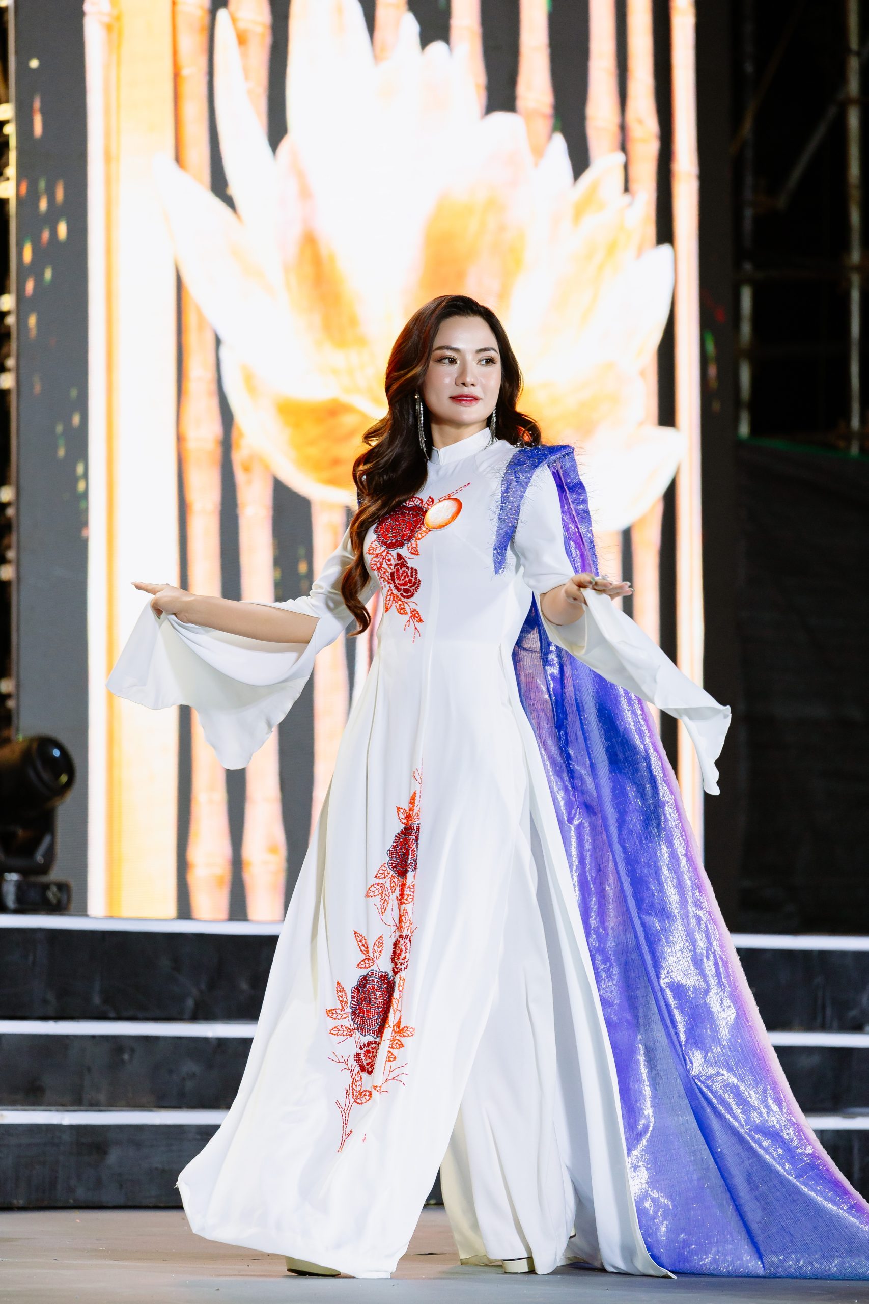 Họa tiết hoa hồng đính đá nhiều gam màu tạo điểm nhấn nổi bật cho bộ sưu tập áo dài “Quý cô phố núi”