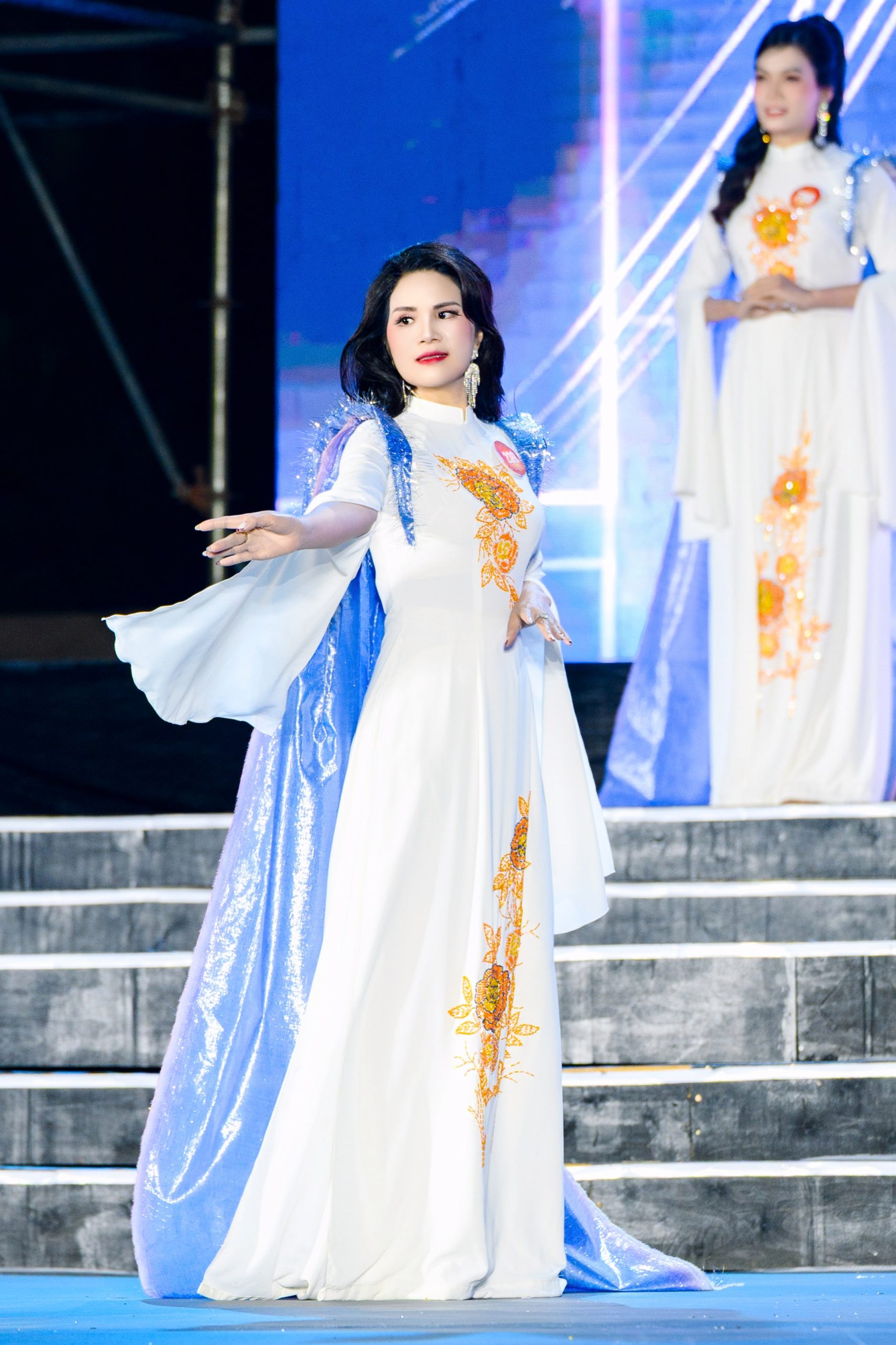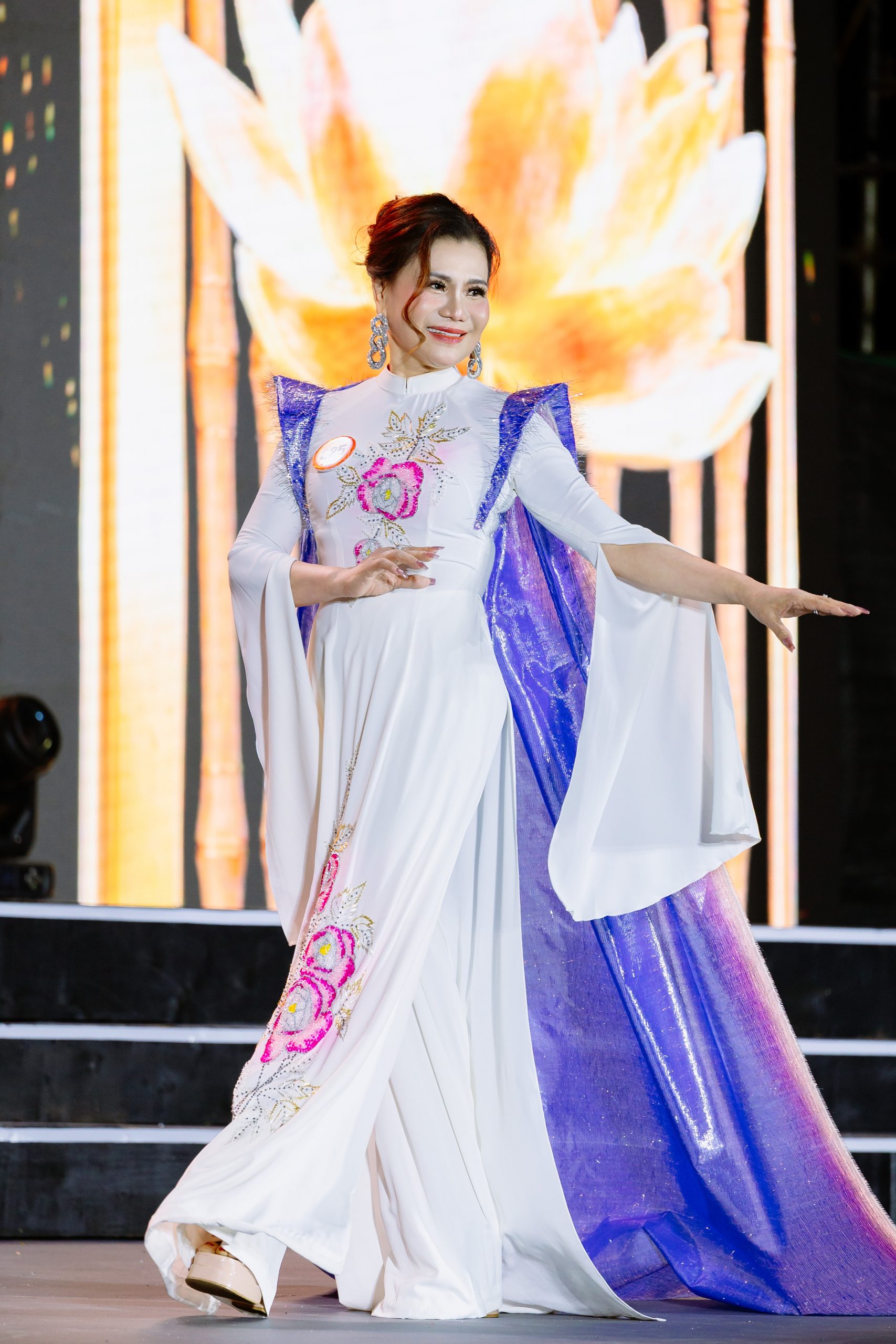 Điểm nhấn đặc biệt đến từ phần áo choàng voan lụa viền lông vũ, góp phần khắc họa hình ảnh người phụ nữ doanh nhân thanh lịch, yêu kiều nhưng vẫn giữ trọn nét đẹp truyền thống. Qua từng bước catwalk, “Quý cô phố núi” còn gợi lên tinh thần văn hóa và vẻ đẹp nền nã rất riêng của tà áo dài Việt.