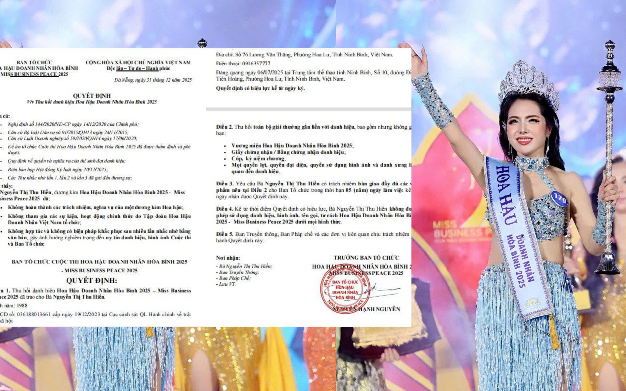 Toàn văn các căn cứ pháp lý và lý do Ban Tổ chức đưa ra quyết định thu hồi vương miện đối với bà Nguyễn Thị Thu Hiền