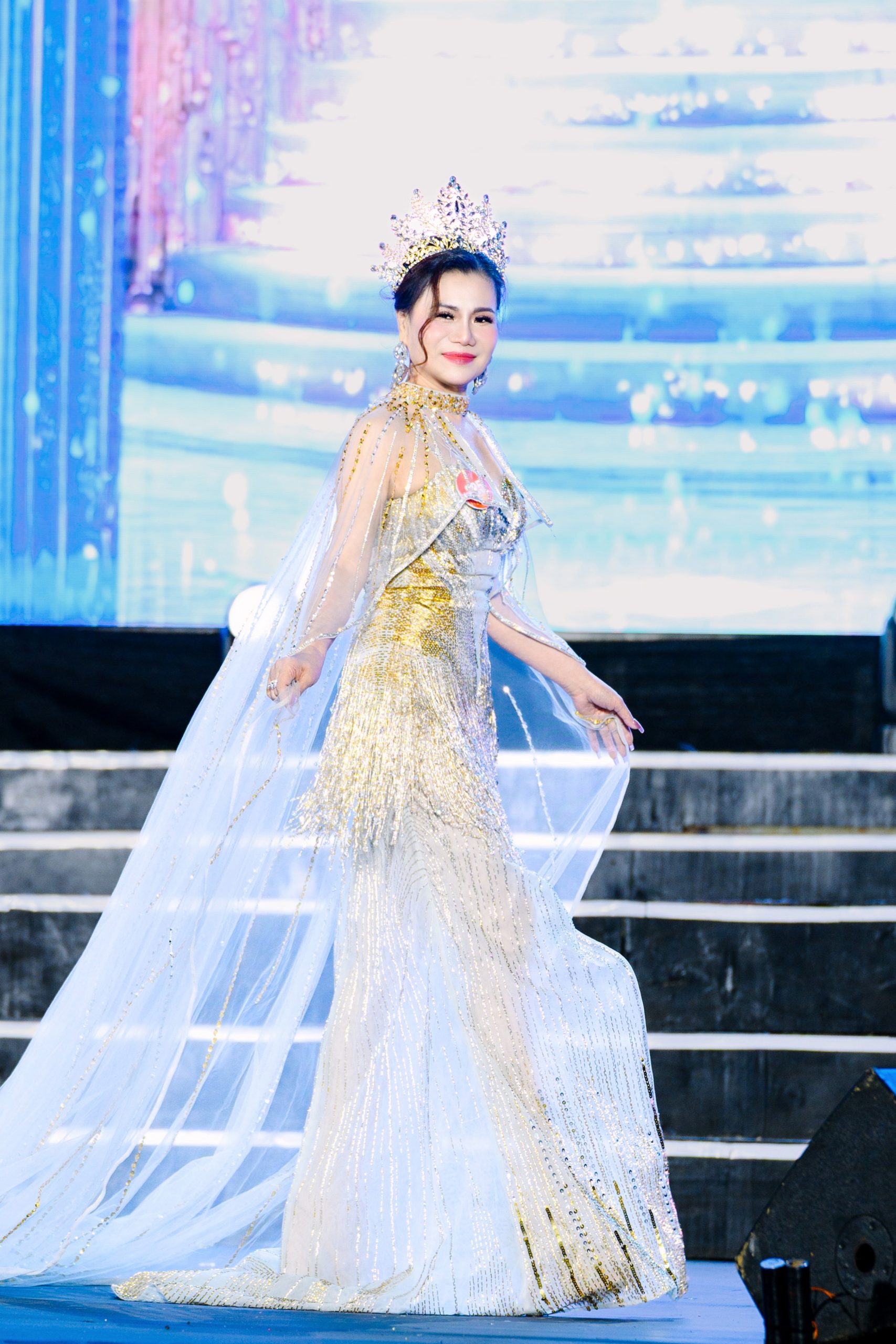 Vedette nổi bật trong thiết kế xanh bạc nhẹ nhàng, kết hợp cape voan dài bay bổng, tôn lên vẻ đẹp thanh thoát và quyền lực